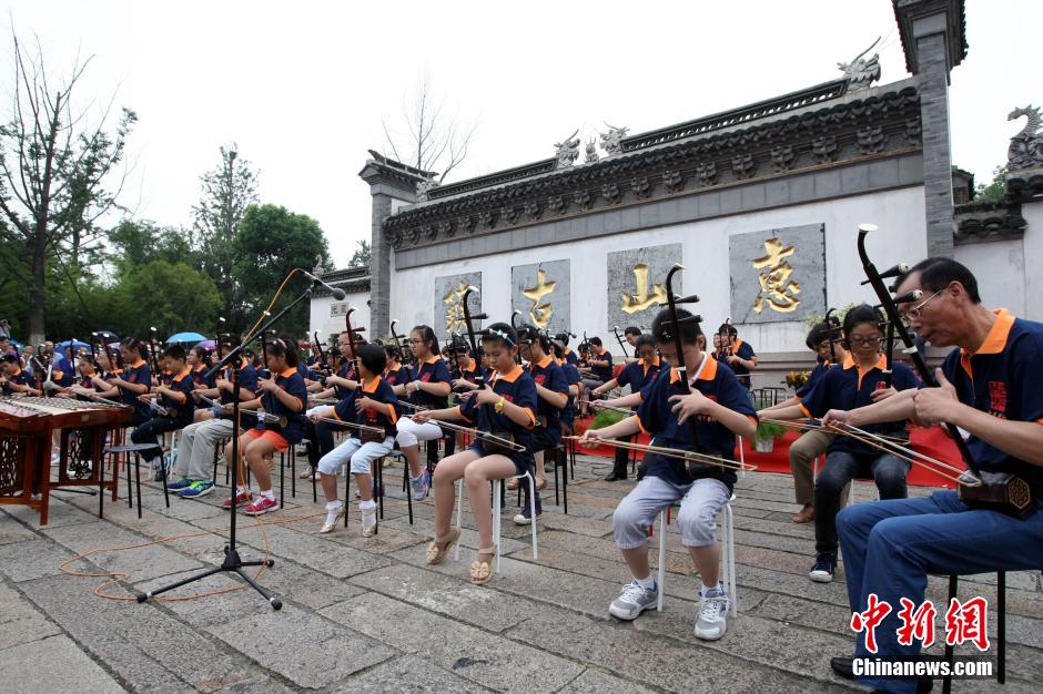 9月8日是中国传统的中秋佳节,百名二胡爱好者在无锡惠山古镇广场上共同演奏《二泉映月》、《良宵》等二胡曲目,其中,最小的表演者年龄才7岁,最大的表演者已是耄耋老人。中新社发 宦玮 摄