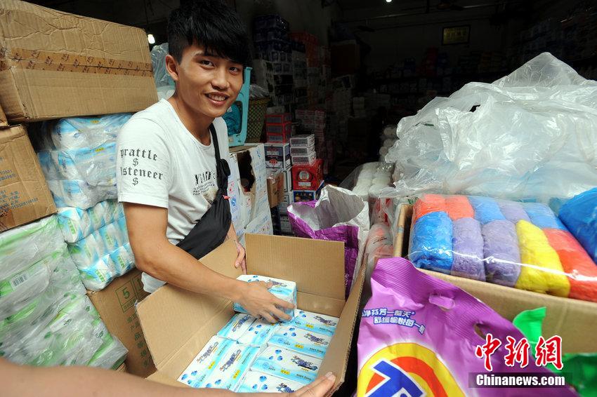 2014年09月08日,重庆,碚区综合批发市场,西南大学大三男生李远皓正在选购女用卫生巾,然后送货上门卖给即将参加军训的男新生做鞋垫。据他介绍,中秋节期间,他仅6日和7日两天时间,每天是早上去离校一站公交车的批发市场购货,晚上上男新生宿舍推销,每天所花时间仅三个小时,他已经赚了600多元钱。图片来源:CFP视觉中国