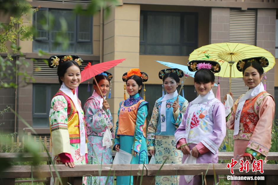 9月8日,模特身穿清装扮成“宫女”在房地产商家新建小区内赏景游玩。当日为传统中秋佳节,河南省许昌市一家房地产公司开展清装美女中秋游园盛典活动,数名美女模特身穿宫廷清装扮成“宫女”在其新建小区内玩“穿越”,独特的创意和仿古的装扮吸引了许多市民。中新社发 耿国庆 摄 图片来源:CNSPHOTO