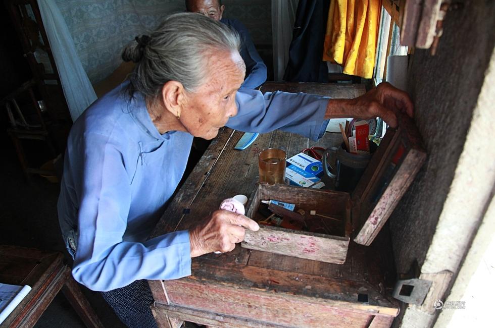 邻居们分析,阿婆爱干净应该是长寿原因之一。“老太多少‘雕笃’(温岭话衣着干净整洁的意思)啊!这年龄了,里外衣服每天都要换洗,还每天刷牙。以前农村妇女刷牙会被人笑话,老太婆怕被人误解,就躲在猪圈边上偷偷刷牙。”图为阿婆得知记者要给他们拍照,悄悄打开镜子端详了一下头发。