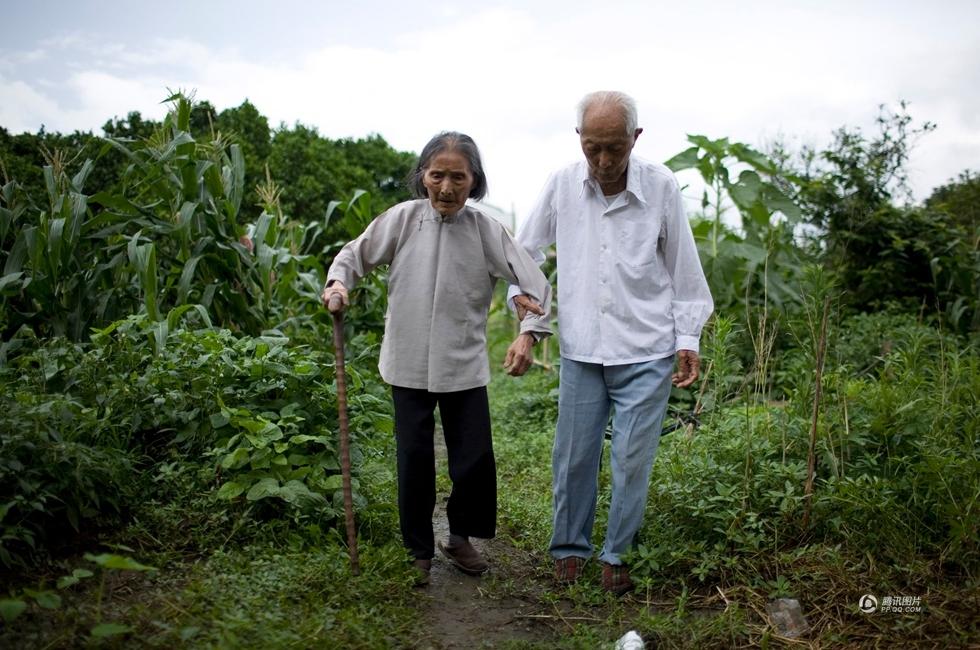 2011年6月21日,浙江台州,饭后两人到边上的菜园里散散步。(潘侃俊/CFP)