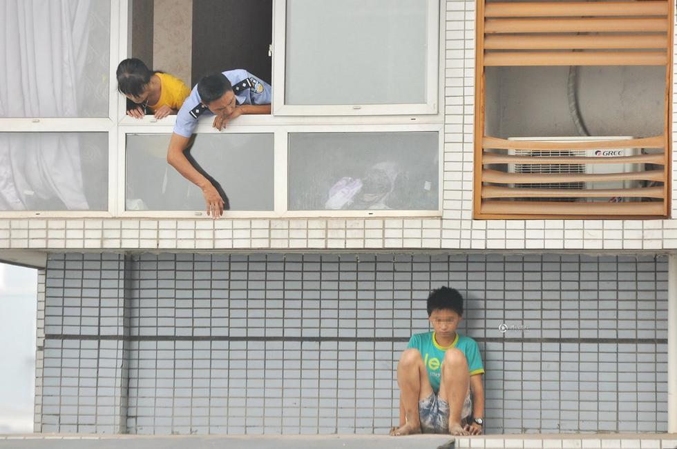 9月8日是中秋佳节,上午9点40分左右,宜宾金凤凰B区的保安罗先生和往常一样,在小区内巡逻。可在经过一栋高楼之时,无意间抬头一看的他却吓出一身冷汗。在11楼的窗口下方的雨棚板上,蹲着一名十来岁的小孩。罗先生赶紧联系了物管值班领导并报了警。在赶到小孩的家中后,他才了解到,这名小孩爬上雨棚板,只是因为不想写作业。记者在该幢楼临街面11楼窗口下方的雨棚板上,看见一名十来岁左右,身着浅蓝色外套的男孩。据大致估算,他蹲处的位置距地面的垂直距离约有35米,他所处的雨棚板大约仅有 0.5 米宽。在他所处位置的上方窗口内,不时有民警和大人将上半身子伸出窗外,对孩子喊话劝导。图为警方从窗口劝道雨棚板上的男孩。