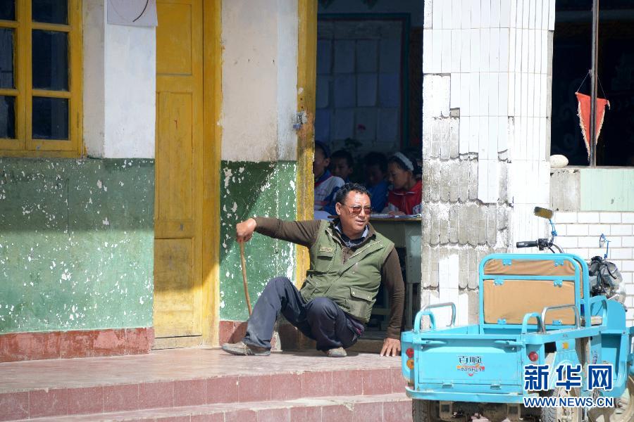 9月9日,陈列江措在课间“走”出教室,由于双腿不能站立,他只能用手支撑地面挪动。新华社记者 王守宝 摄