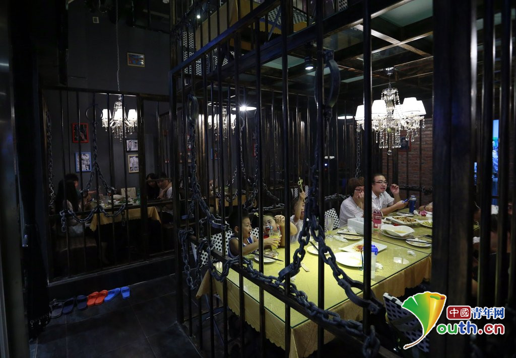 当地时间2014年9月9日,天津,食客在“监狱”中用餐。天津首家“监狱风云”主题餐厅对外营业。餐厅的每个包间是一个单独的“牢房”,用铁笼制成,室内设计完全参照监狱模式,分有“水牢”“天牢”“禁闭室”等,可容纳不同数量的客人。据这家餐厅的老板称,开办“监狱”餐厅的本意是希望人们珍爱自由,远离犯罪,远离监狱。
