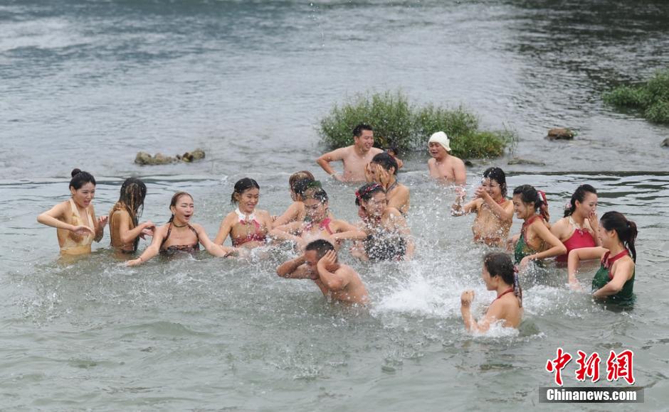 9月10日,湖南张家界溪布老街河畔,众多土家族姑娘走进冰冷的河水中进行“天沐浴”,以这种独特的方式祈求今年的农作物能获得丰收。 杨华峰 摄