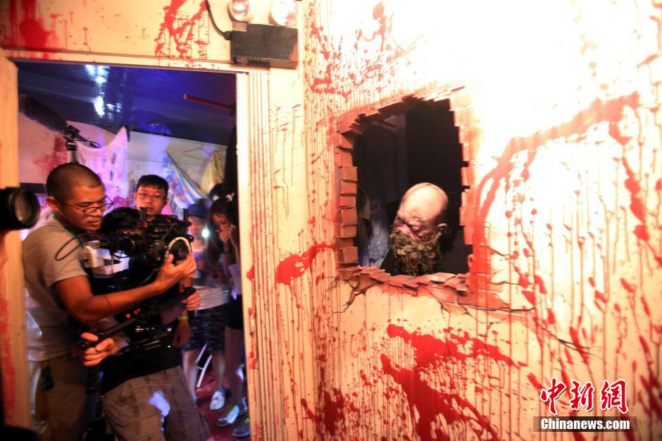 9月10日,香港记者在海洋公园万圣节鬼屋感受“鬼屋日夜大变身”的全新运作模式。而香港金像奖最佳视觉效果电影《殭尸》幕后班底与公园的首度合作,更呈现令人惊栗的电影旧屋邨场景。广受大众欢迎的哈啰喂在今年加入终极恐怖鬼屋及多重革新刺激节目,力求让观众从“超级丧惊”玩到“惊喜狂笑”的双重体验。中新社发 洪少葵 摄