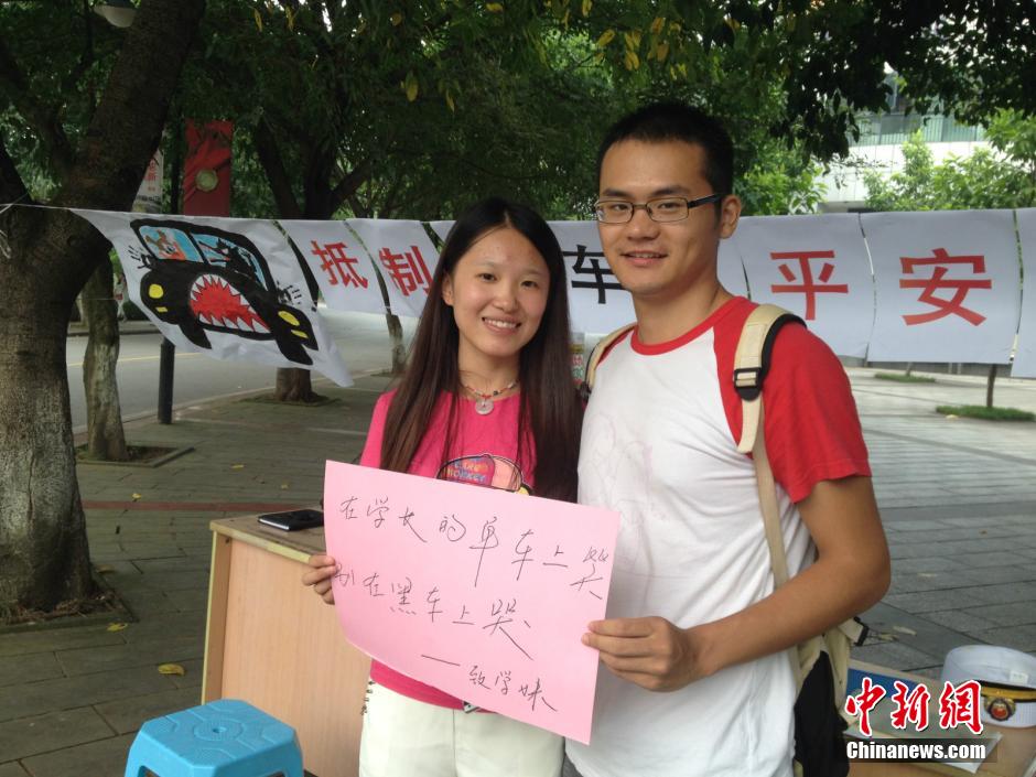 9月10日,重庆市交通行政执法总队在重庆大学城开展了“迎新季,NO黑车?温馨提示大比拼”活动。在重庆科技学院,学校保安、接送学生报到的学生家长也积极参与,给新生们留下安全寄语。一对大四的学生情侣为即将来校的学弟学妹们留下了一句温情脉脉的提示:“在学长的单车上笑,别在黑车上哭。”图为大四情侣:在学长的单车上笑,别在黑车上哭。 谯治 摄