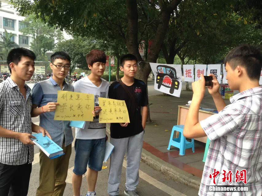 图为大三男生:别坐黑车,学长载你;黑车易被黑,还是单车好。 谯治 摄