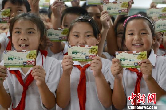 图为小学生收获“阅读存折”兴奋地展示。 王思哲 摄