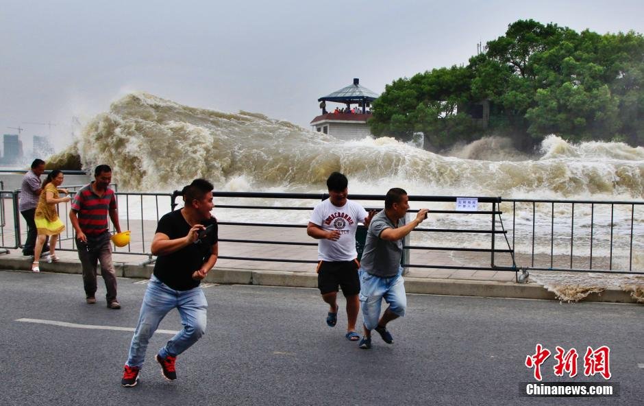 在九溪珊瑚沙水闸,潮水的冲击力极强,掀翻护栏、电动车和观潮人群,受伤人数达数十人。中新社发 陈加华 摄