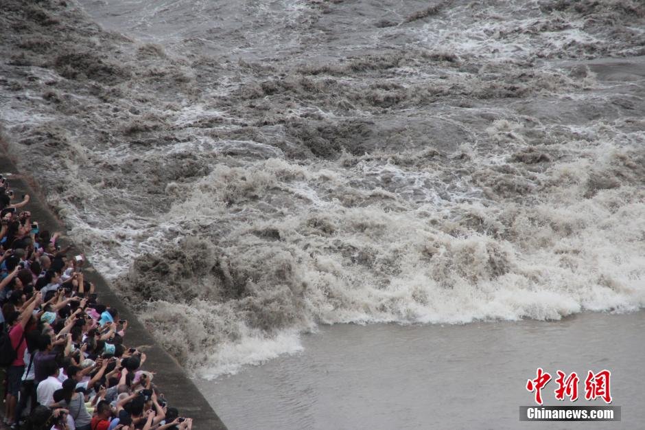 9月11日13时15分,近四年来最大的农历八月十八钱塘潮如约而至抵达浙江省海宁盐官,来自世界各地的13.8万名中外游客争睹“天下第一潮”。中新社发 胡佳棋 摄