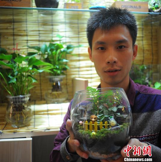 一片枯叶激荡着细碎的阳光;一个被丢弃的玻璃瓶映着游动的波纹;一只蜗牛慢慢地在一棵草上爬;一只龙猫撑着小伞……宫崎骏的童话世界在一个小玻璃器皿中变得真实可见。一年前,“90后”饶蛟阳尝试将景观设计融入盆栽中做成微缩景观之后,便爱上了这项创作。他采用宫崎骏童话里的场景来创作微缩景观,真实还原宫崎骏的童话世界。“制作微缩景观,得先选花盆,盖上土,放上枯木、石头等构架,用胶水固定好,然后种上植物。因为植物小,所以工具也很迷你,用的都是小耙子、小铲子、镊子等等。”目前,饶蛟阳在杨家坪步行街拥有一家自己的小店,每天都和花花草草在一起,“这些小小的花花草草就像在讲故事,很有意思。”他每个微缩景观都是独一无二的。