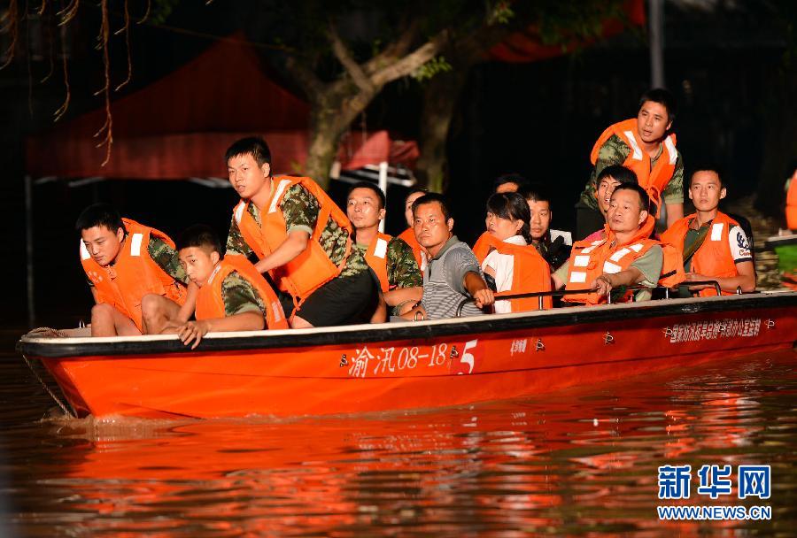 12日以来,重庆东北部、中西部地区普降大到暴雨、局部地区出现大暴雨,最大雨量超过200毫米。为应对暴雨洪水灾害,重庆市防汛抗旱指挥部13日9时启动防汛Ⅳ级应急响应。13日晚,受特大暴雨影响,重庆市渝北区统景镇景同一支路、景正路、景富路等路段受灾严重,部分路段水深2米以上,位于统景老街的老轧钢厂、敬老院、中心医院以及居民房屋被洪水围困。灾情发生后,武警重庆总队、消防、民兵预备役和当地政府组成的应急救援队紧急搜救转移受灾群众。新华社发 (谢江 摄)
