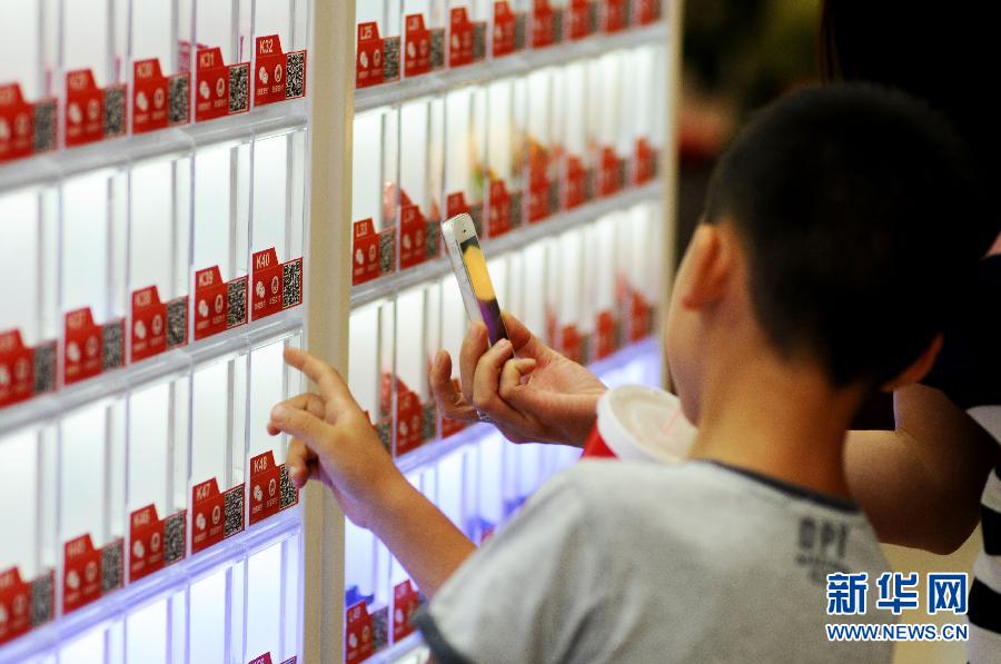 9月13日,顾客在“无人超市”内使用手机选购商品。近日,一个无售货员、无收银员、可微信支付购买商品的“无人超市”现身青岛延吉路万达广场。这家无人超市面积约二十平方米,由多台自动售货机组成,顾客可使用纸币、硬币,也可以通过手机扫描二维码,用微信支付的方式购买商品。 新华社发(王海滨 摄)