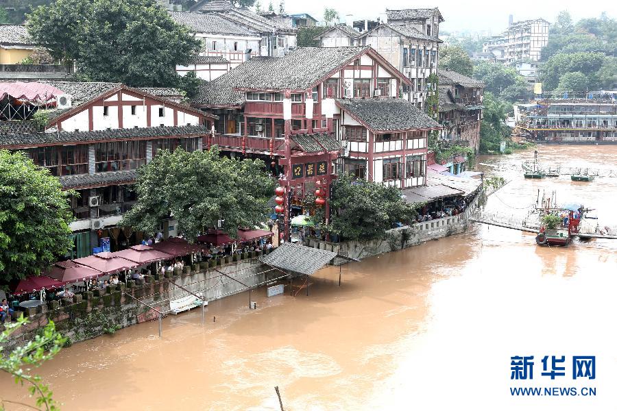 这是9月14日拍摄的被洪水淹没的重庆市磁器口。受上游连续降雨影响,嘉陵江重庆段将于9月15日中午迎来今秋最大一次洪峰,水位预计将达到184米左右。9月14日14时重庆磁器口最高水位181米,部分商铺和房屋被淹。重庆市防汛和海事部门发出紧急通知,提醒过往船只避开洪峰水位航行,洪峰过境期间市民不要到江中游泳,江边居住的居民注意安全。新华社发(敬海全 摄)