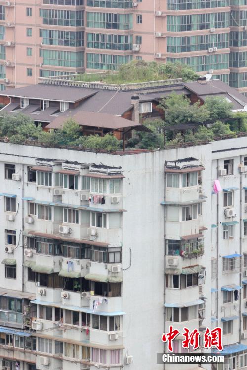 根据王先生提供的图片,记者找到了这栋名叫“小南湖大厦”的12层居民楼。爬上附近一处高楼,记者发现该楼顶层确实存在一栋两层建筑,看着像是别墅,墙体上装有窗户和烟囱,四周则种有不少花草。