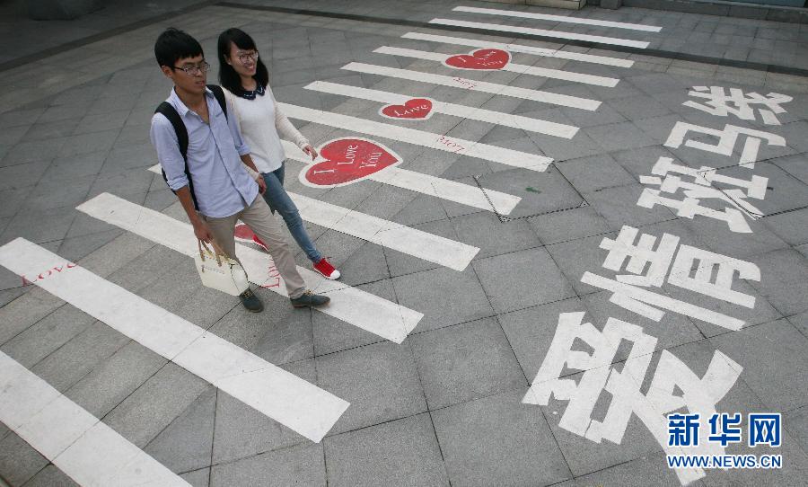 9月14日,情侣从南京市郊仙林地区一座商城的“爱情斑马线”上经过。近日,这座商城的电梯、停车场出入口等处的步行区域内出现了3条“爱情斑马线”,红色的桃心、英文“我爱你(I LOVE YOU)”字样,让过往的行人感受到一股浪漫气息扑面而来。 新华社发(颜闽航 摄)