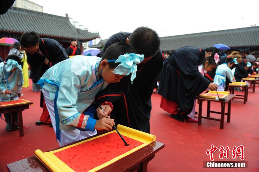 9月14日,在长春文庙,50名身着传统服装的幼童在家长的陪伴下,参加了一场传统启蒙礼。通过献帛、行拜师礼、诵读《弟子规》、书写“仁”、“人”二字等活动,使孩子们了解中华传统文化与礼仪。张瑶 摄