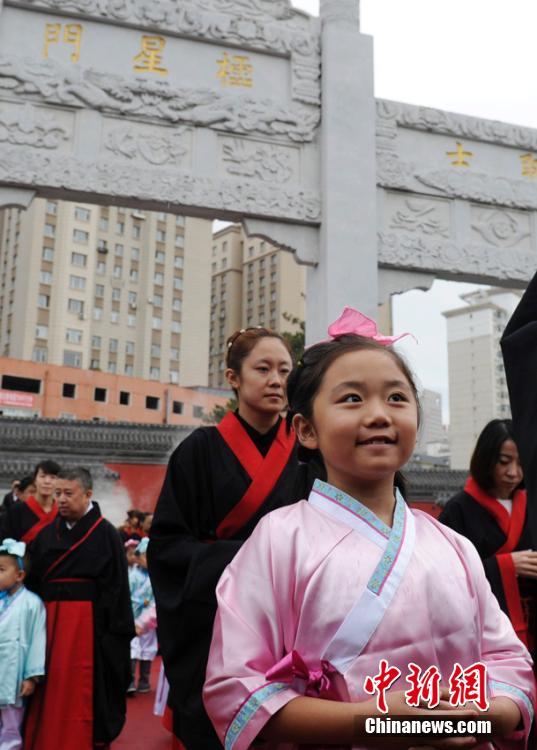 9月14日,在长春文庙,50名身着传统服装的幼童在家长的陪伴下,参加了一场传统启蒙礼。通过献帛、行拜师礼、诵读《弟子规》、书写“仁”、“人”二字等活动,使孩子们了解中华传统文化与礼仪。张瑶 摄