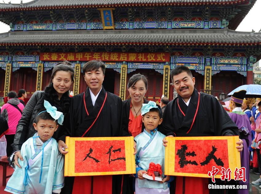 9月14日,在长春文庙,50名身着传统服装的幼童在家长的陪伴下,参加了一场传统启蒙礼。通过献帛、行拜师礼、诵读《弟子规》、书写“仁”、“人”二字等活动,使孩子们了解中华传统文化与礼仪。张瑶 摄
