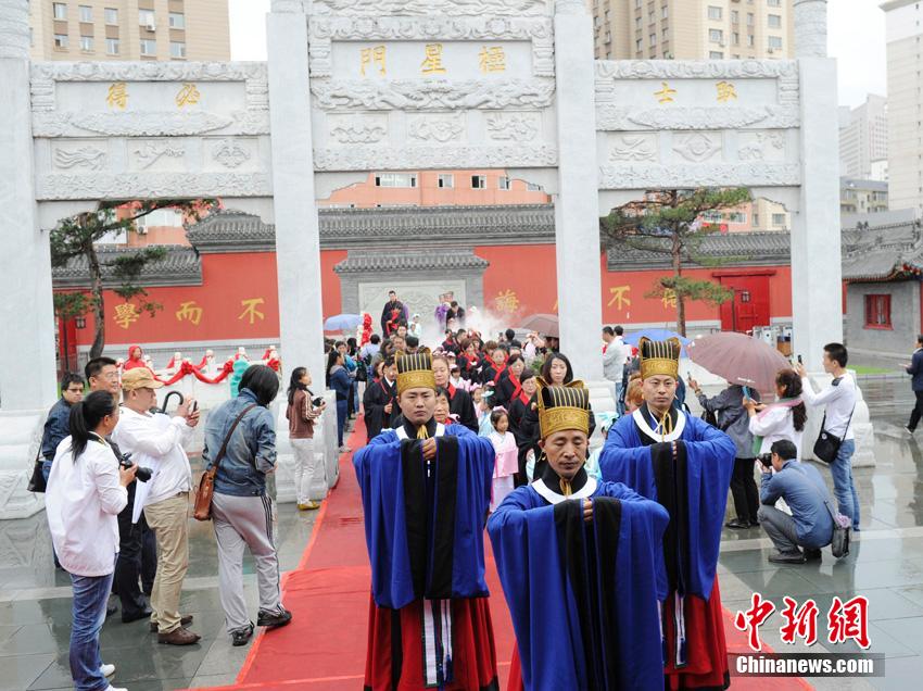 9月14日,在长春文庙,50名身着传统服装的幼童在家长的陪伴下,参加了一场传统启蒙礼。通过献帛、行拜师礼、诵读《弟子规》、书写“仁”、“人”二字等活动,使孩子们了解中华传统文化与礼仪。张瑶 摄