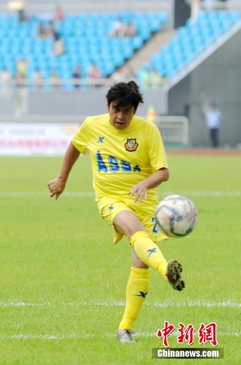9月13日,2014中国(郴州)香港明星足球赛在湖南郴州开踢,由谭咏麟、黄日华带领的香港明星队以4:2战胜郴州瑞成队。据了解,本次比赛的组委会将把活动收入的百分之六十投入郴州600所贫困学校,资助当地中小学体育设施建设以及儿童学习生活费用。 图为谭咏麟进行赛前热身。杨华峰 摄