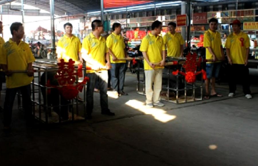 9月13日,在南宁市五一路某农贸市场内,一家新开张的猪肉铺张灯结彩,给两头大黑猪办起了喜事。婚礼进行曲、伴郎伴娘、拜堂、敬茶等等一应俱全。店老板别出心裁,但不知顾客买不买账?图为猪“婚礼”的现场。 见习记者 蒋娟娟摄(广西新闻网-南国早报)