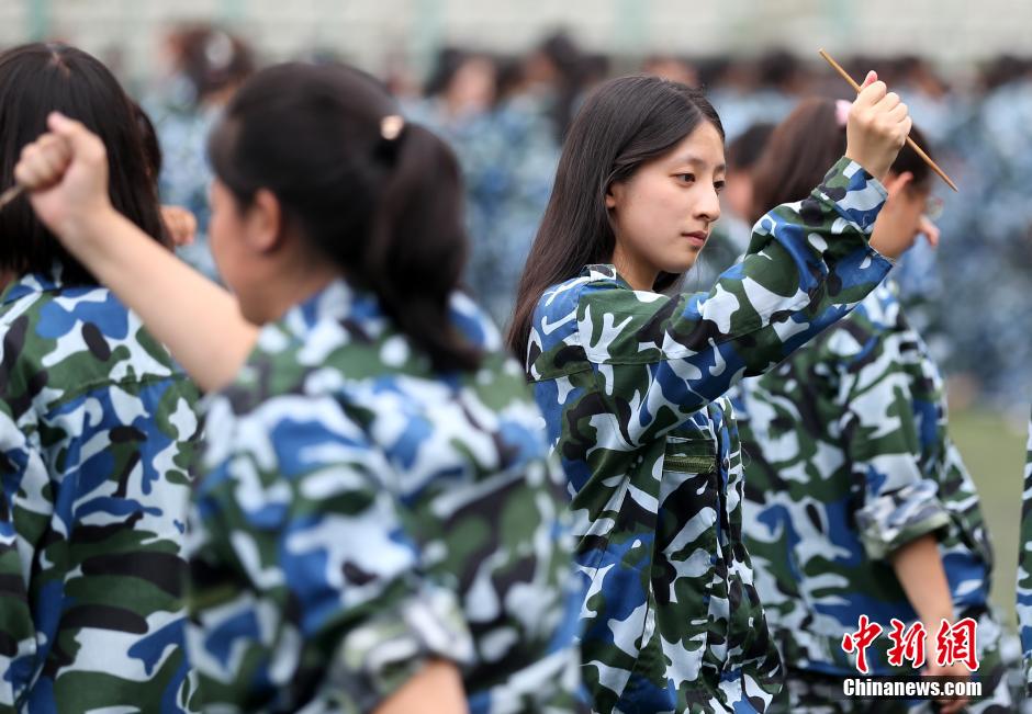 9月16日,南京农业大学的大一女生们在进行军训。近期的中国内地各大高校校园内陆续吹响“集结号”,步伐声、口号声响彻操场,作为大学第一课的军训全面展开。中新社发 泱波 摄