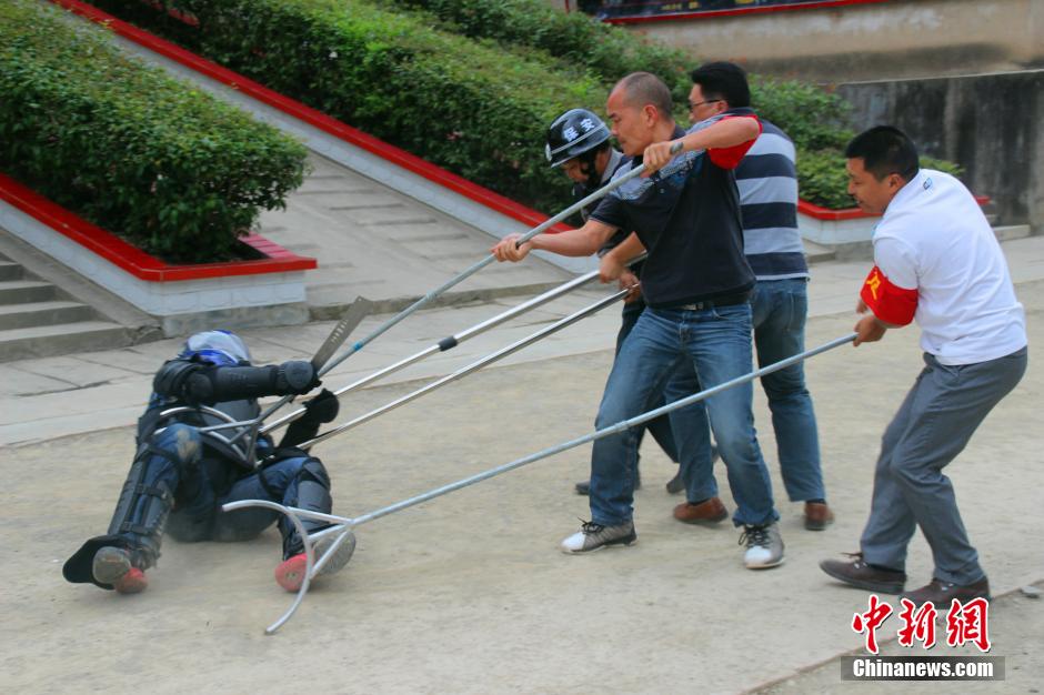 9月16日,湖北长阳土家族自治县警方在该县渔峡口镇中心学校进行了一场防恐处突实战演练。演练时,由一位民警扮演的“暴徒”挥舞着手中的砍刀向操场上的师生冲去。执勤校园保安立即按响警铃并报警,听到警报后,老师迅速疏散学生,5名护校队队员立即集结,带好钢叉、木棒对该“暴徒”进行拦截,并将该“暴徒”叉倒在地。派出所民警接到报警后迅速赶往现场,将已被护校队员用钢叉控制的“暴徒”带离现场。胡锐 摄