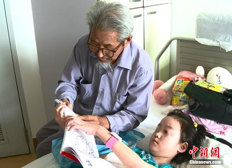 9月15日,河北医科大学第三医院,84岁老人苏福林正给因交通事故致截肢的小涵讲故事。除了捐钱,老人还买了彩笔等文具送给她。苏福林是河北石家庄一名普通退休工人,24年来,没有受过高等教育的他每月除了给自己留下基本的生活费外,剩下的退休金全都捐给了需要帮助的人。一共捐了多少钱,帮助过谁,他自己并不记得。中新社发 翟羽佳 摄