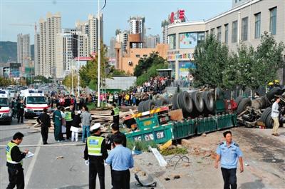 多位目击者称,当时货车上拉着木棍和钢管等建筑材料,货车侧翻后,公交站台附近的多人被散落的建筑材料压住。目击者吴先生称,大货车在将公交站台“抹平”后,又冲向路旁的房子,直到撞上墙壁才停下来。昨日下午,事发地点附近,公交站台旁的路灯柱倒在路上,断成10截。公交站台旁的房屋,一大块儿外墙墙皮脱落,窗子严重变形。救护人员称,清理建筑材料时,被压在下面的市民不下10人,“包括一名孕妇。”