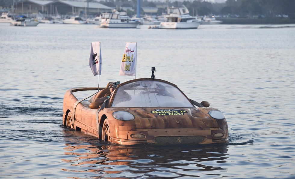 这位叫狄马奇(Livio De March)的老兄,是意大利的一位艺术家。他爱法拉利,但是他住在运河遍布的威尼斯,要在陆路上飙法拉利实在很难。于是他因地制宜,打造了一“艘”全松木制成的Ferrari F50“水上版"!