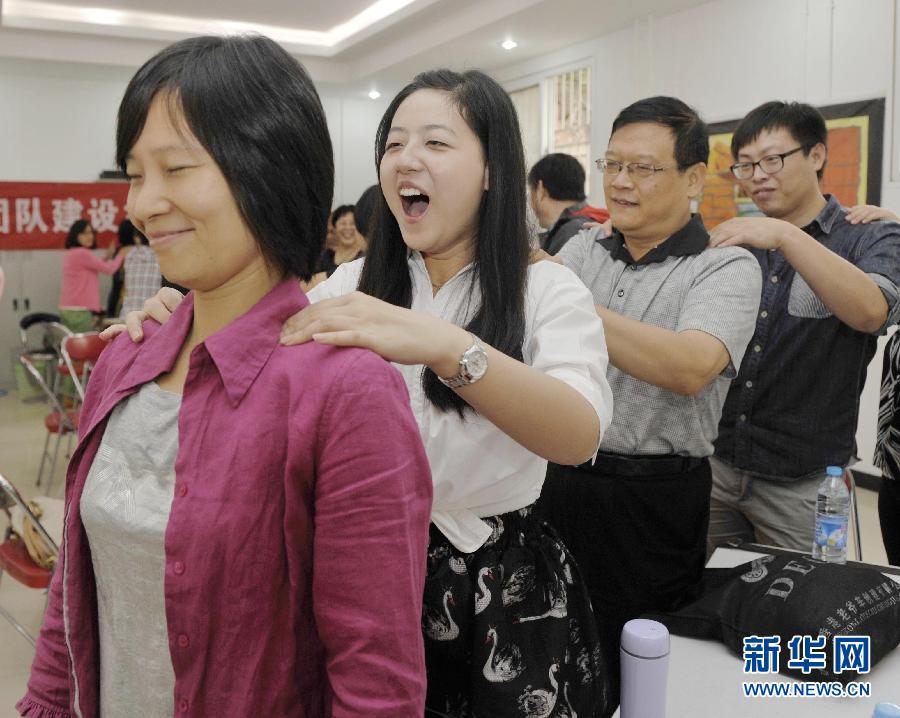 9月17日,北京市东城区永定门外街道的几名社区干部在拓展培训时为队友“揉肩”。当日,北京市东城区永定门外街道在所辖的永铁苑社区,为来自辖区20个社区的60多名社区干部、社区工作者进行拓展培训,通过轻松愉快的团队游戏,体验、分析了团队运作时在人员沟通、合作等方面产生的问题和解决的办法,增进工作人员之间的了解,增强团队的凝聚力。新华社记者宋为伟摄