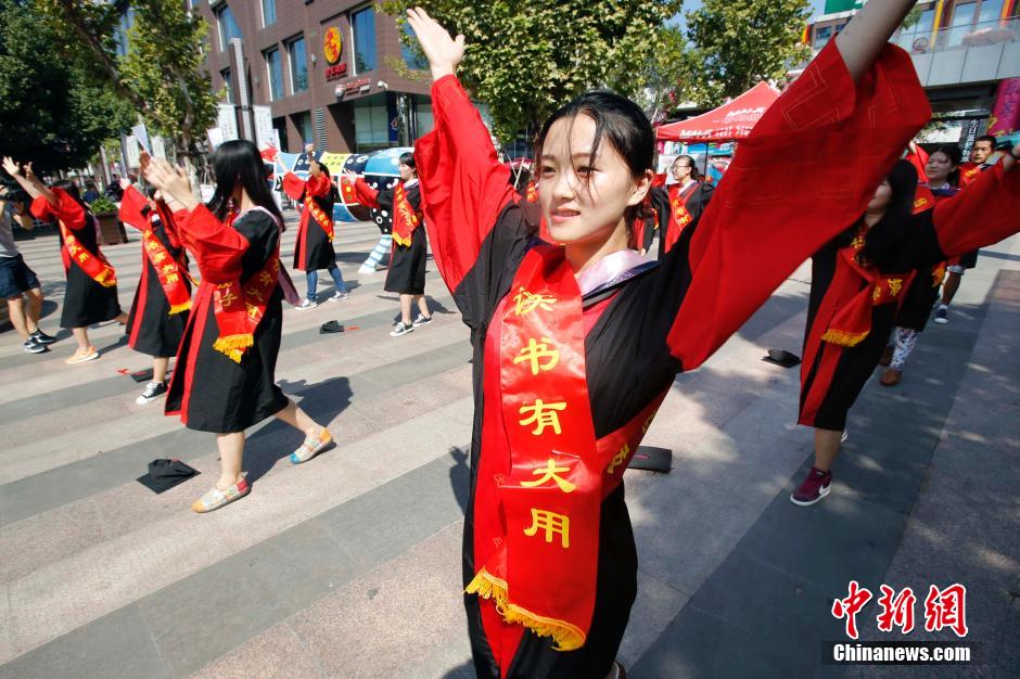 9月21日,武汉光谷天地商业街上的人群中突然冒出一群身穿博士服的年轻人,在众目睽睽之下跳起了第二套广播体操。当那一段学生时代标志性的旋律响起来。众多路人围观手机拍摄,在广播体操结束后,这些年轻人一起大喊“读书大有用 知识换房子”的口号。然后消失在人群中。后来才得知这是位于华中科技大学边上的一地产商组织的一次快闪活动。呼吁社会上人们在追求物质财富的同时,不要忽略精神文化的力量,倡导读书有用。 张畅 摄