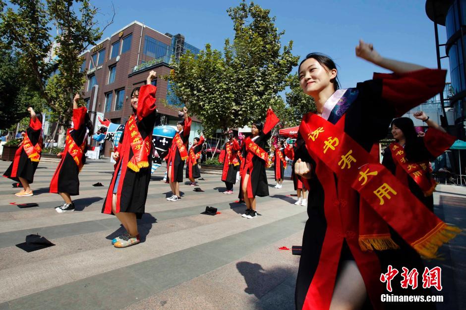 9月21日,武汉光谷天地商业街上的人群中突然冒出一群身穿博士服的年轻人,在众目睽睽之下跳起了第二套广播体操。当那一段学生时代标志性的旋律响起来。众多路人围观手机拍摄,在广播体操结束后,这些年轻人一起大喊“读书大有用 知识换房子”的口号。然后消失在人群中。后来才得知这是位于华中科技大学边上的一地产商组织的一次快闪活动。呼吁社会上人们在追求物质财富的同时,不要忽略精神文化的力量,倡导读书有用。 张畅 摄