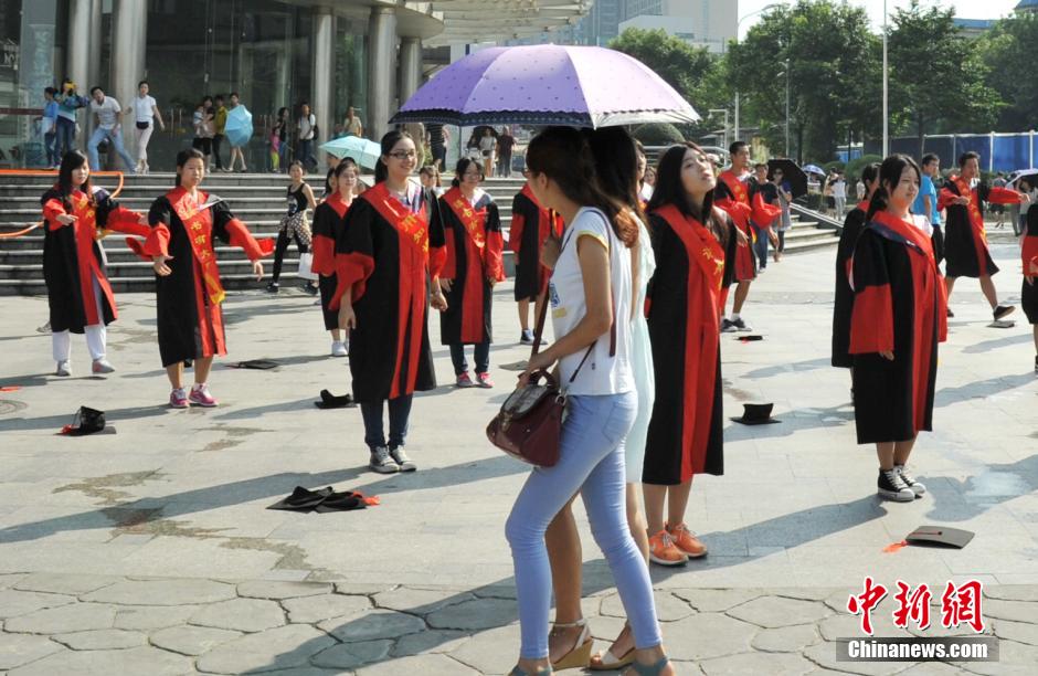 9月21日,武汉光谷天地商业街上的人群中突然冒出一群身穿博士服的年轻人,在众目睽睽之下跳起了第二套广播体操。当那一段学生时代标志性的旋律响起来。众多路人围观手机拍摄,在广播体操结束后,这些年轻人一起大喊“读书大有用 知识换房子”的口号。然后消失在人群中。后来才得知这是位于华中科技大学边上的一地产商组织的一次快闪活动。呼吁社会上人们在追求物质财富的同时,不要忽略精神文化的力量,倡导读书有用。 张畅 摄