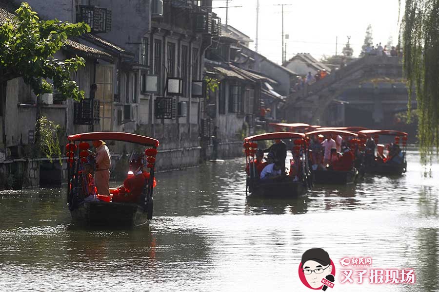 昨天(9月21日),枫泾古镇的小河上,一溜的小船一字排开游玩古镇,船上是一对对参加集体婚礼的新人,而这些新人有些特殊,起码有一方是外籍人士。新民网 图