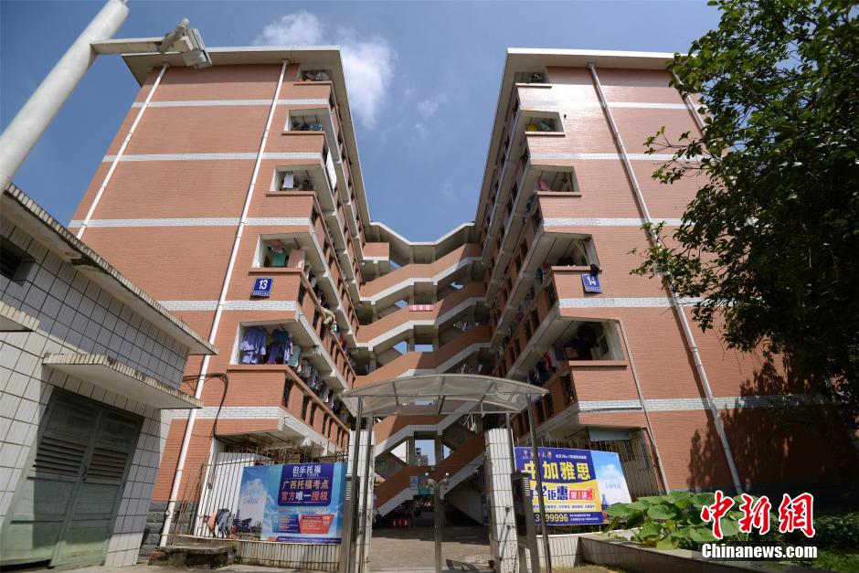 2014年9月21日,广西南宁市,在广西大学校园里面有一栋奇特的学生宿舍楼层建筑。楼层之间通过一个双向楼梯层层相连,连连相扣。这栋建筑的奇特之处在于它是两栋学生宿舍建筑连起来的楼层建筑,总共有6层,从中间楼梯上去,两栋楼之间都可以通过同一个楼梯互相通行。中新社发 任风 摄 图片来源:CNSPHOTO
