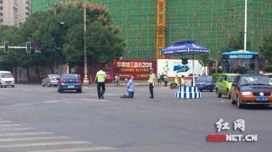 “三分钟左右后,彭某终于出示证件,在民警核查证件时突然在路口中央跪下,民警多方劝阻无效。随后,二中队指导员熊伟赶到,责成违法驾驶人将车移至路边后,随后将其带至岗亭询问,并通知118线路负责人前来配合处理。”
