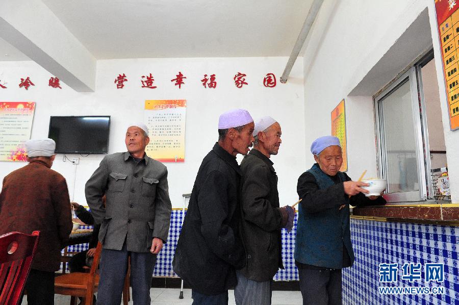 在宁夏回族自治区泾源县泾河源镇,老人们在村里开办的“老年饭桌”排队打饭(5月22日摄)。
