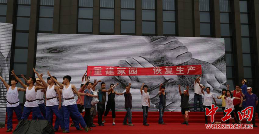 从贵州到太原,从四川到湖南,再到唐山陡电和首都北京,一公司人听从祖国召唤,转战祖国大江南北。极具地方特色歌舞《苗岭飞歌》把大家带到了公司人施工贵州的施工场景;对唱表演《浏阳河》把大家带到了公司施工的湖南;河北名歌《放风筝》的音乐声响起,舞蹈中演员们又把大家带到了公司施工的唐山陡河电厂。漫天乌云飘来,舞台上传递孩子、抬担架、背伤员等场景表演,又把大家带到了公司在唐山抗震救灾中,公司人怀着悲痛掩埋好同伴和家人们的遗体,重建家园、重建电厂的施工场景。图为演出现场。中工网记者 耿瑜 摄