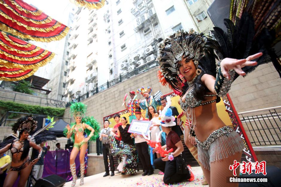 9月25日,一众嘉宾与森巴舞女郎热舞登场,为10月11日至12日在香港兰桂坊举行的嘉年华盛事宣传。这项香港一年一度的大型户外派对,将汇集世界各地美食佳肴和精彩表演节目,吸引游客光临狂欢。中新社发 洪少葵 摄