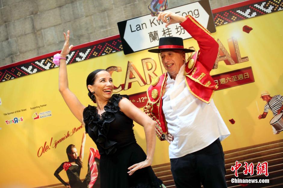 9月25日,香港“兰桂坊之父”盛智文与西班牙舞蹈家登场表演,为10月11日至12日在香港兰桂坊举行的嘉年华盛事宣传。这项香港一年一度的大型户外派对,将汇集世界各地美食佳肴和精彩表演节目,吸引游客光临狂欢。中新社发 洪少葵 摄