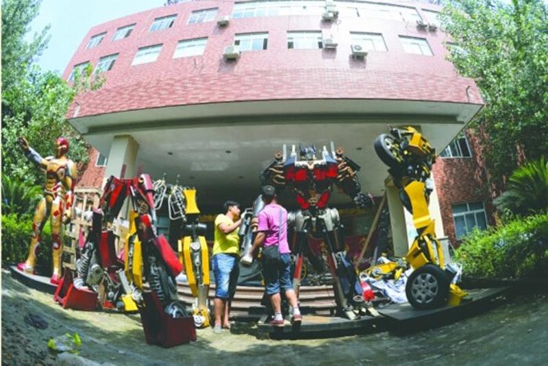 制作这些像变形金刚的机器人是刘世学的梦想。作为一个80后,“变形金刚”伴随着他一起成长。“有次吃饭时几个朋友聊起了这个事,结果大家都有兴趣。那就试试了。”那时的刘世学还是成都理工大学的大三学生。周末出去找材料,回校后尝试着用不同零件拼接变形金刚的各个部位。没有人指导,只能看着电影海报做着玩。从20厘米的小样做起,一个个变形金刚在他们的设想中孕育出来,20厘米到50厘米,50厘米到2米、12米……越做越好,越玩越大。图为刘世学和伙伴检修自己制作的机器人。 图片来源:四川在线