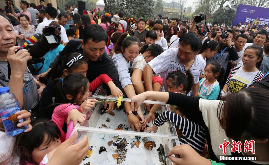 河南蝴蝶科普展 市民哄抢放飞的蝴蝶