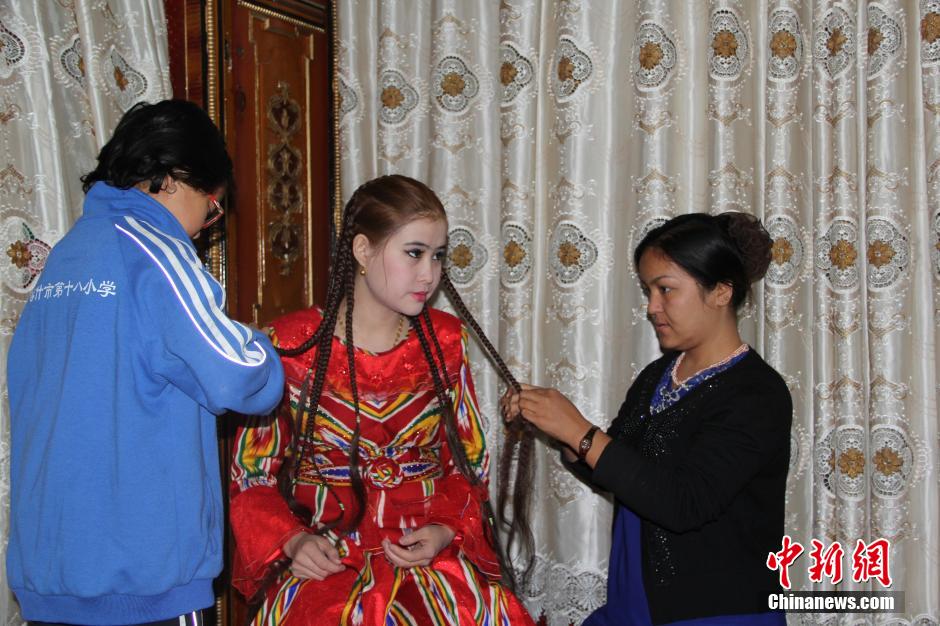9月28日6时许,家住喀什噶尔老城艾格孜艾日克路的克得利雅开始梳辫化妆,准备参加11时在艾提尕尔广场举行的百对新人集体婚礼。中新社发 朱景朝 摄