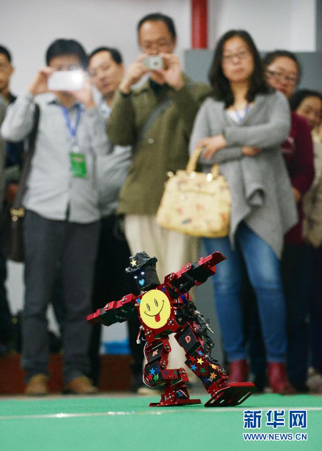 9月28日,一个机器人在参加舞蹈比赛项目。当日,2014年内蒙古自治区大学生机器人大赛在内蒙古工业大学开赛。此次比赛共有内蒙古5所本科院校近80名同学制作的33个机器人参赛。新华社发(王靖 摄)