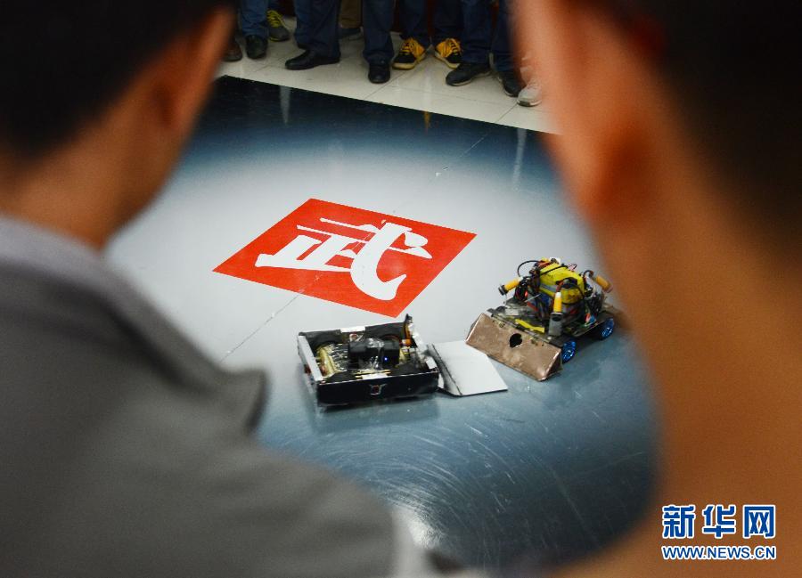 9月28日,两个机器人在进行对决。当日,2014年内蒙古自治区大学生机器人大赛在内蒙古工业大学开赛。此次比赛共有内蒙古5所本科院校近80名同学制作的33个机器人参赛。新华社发(王靖 摄)