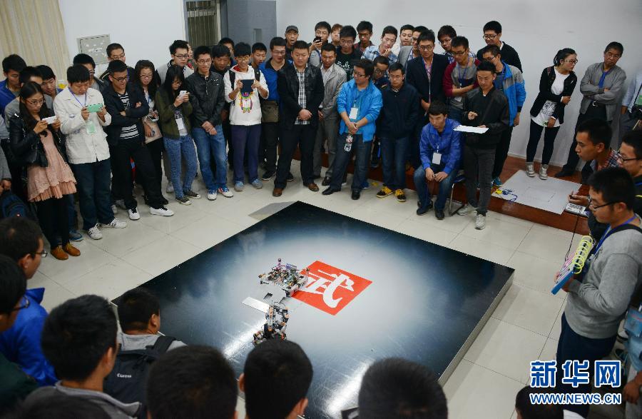 9月28日,两个机器人在进行对决。当日,2014年内蒙古自治区大学生机器人大赛在内蒙古工业大学开赛。此次比赛共有内蒙古5所本科院校近80名同学制作的33个机器人参赛。新华社发(王靖 摄)