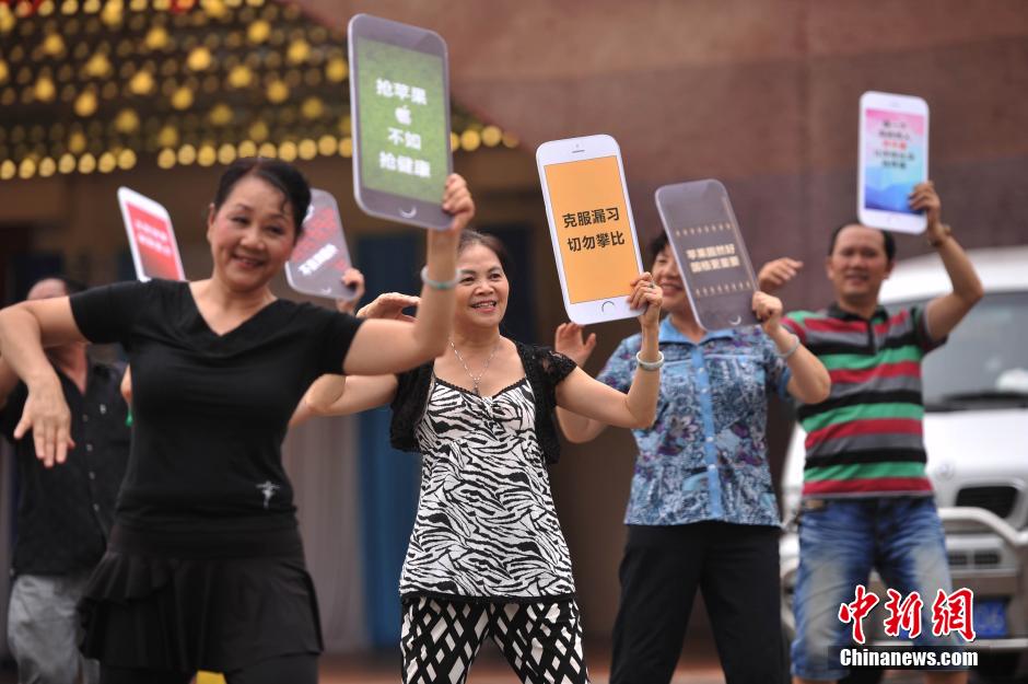 9月26日,随着歌曲《小苹果》节奏的响起,重庆洋人街广场上大妈们举着iphone6模型跳舞。iphone6模型上写着:“抢苹果不如抢健康、我们不是果粉不跟风、文明购买理性消费”等标语。大妈们想利用这样的行为艺术方式呼吁民众树立正确的消费观。图为大妈们举着iphone6模型正在跳坝坝舞。陈超 摄